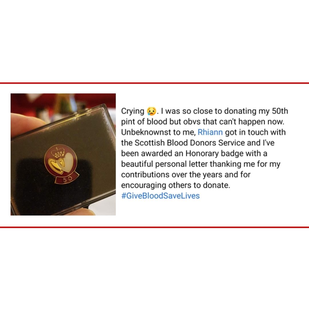 Rhiann got in touch with the Scottish National Blood Transfusion Service to ask if she could give five donations on behalf of her mum, to allow her to achieve her 50th donation. It was all arranged and Stella received her gold award in the post. On the day she received her award, Stella captured her thoughts in this Facebook post: