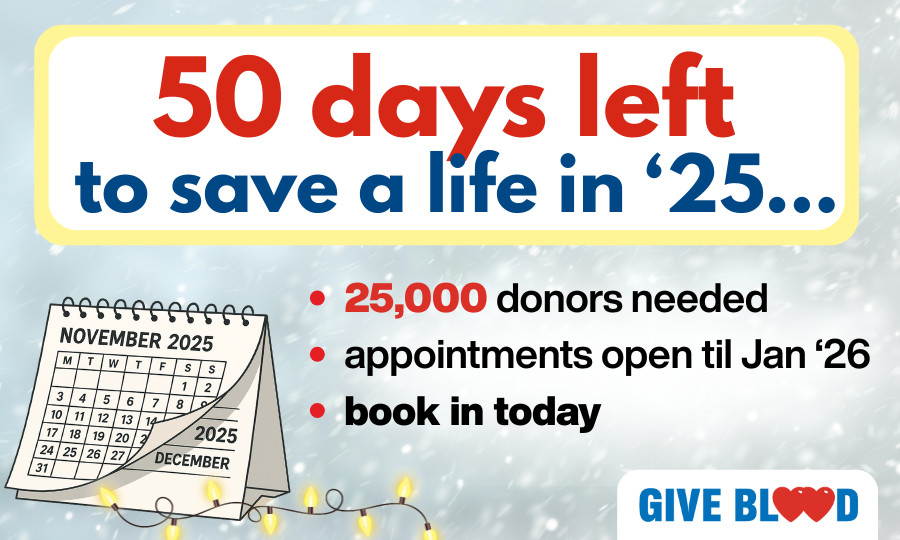With 50 days left of 2025, all blood groups are needed to support the important Winter and Festive period. In order to best support this, we've opened appointment grids early this year – with appointments available to book right up to the New Year.