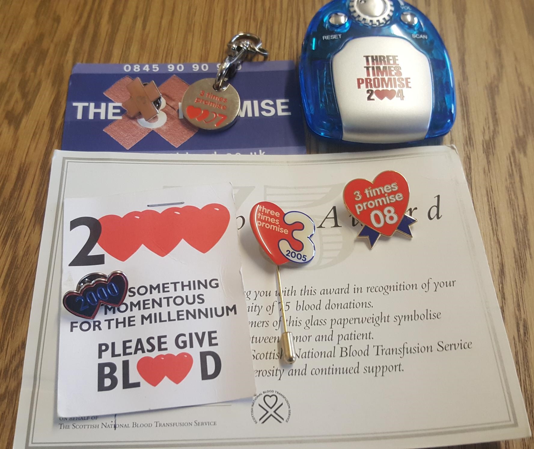 Over the years, William has collected a number of awards and memorabilia. One that crops up in his collection is the ‘three times promise.’ This campaign involved asking blood donors to pledge to give blood three times a year. However, over the years, blood collection has become more sophisticated. Innovations like keyhole surgery and working with hospitals to pre-plan use of blood means that we no longer need donors to make the three times promise.
