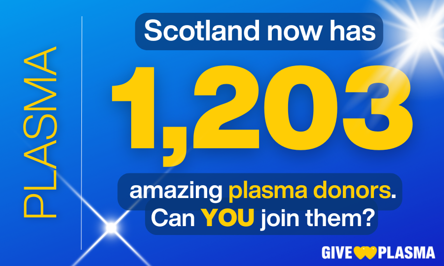 Scotland now has 1,203 incredible plasma donors - thank you. But to help meet patient needs, we aim to welcome more. In the next few months, we’d love another 1,000 very special people to come forward.